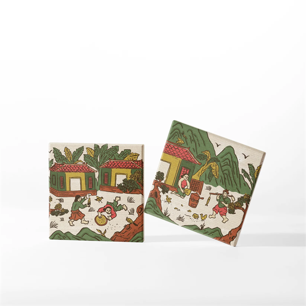 The canvas captures everyday events, combining elements of folk art with animated versions of familiar proverbs and sayings, reflecting the rhythm of Vietnamese life.
